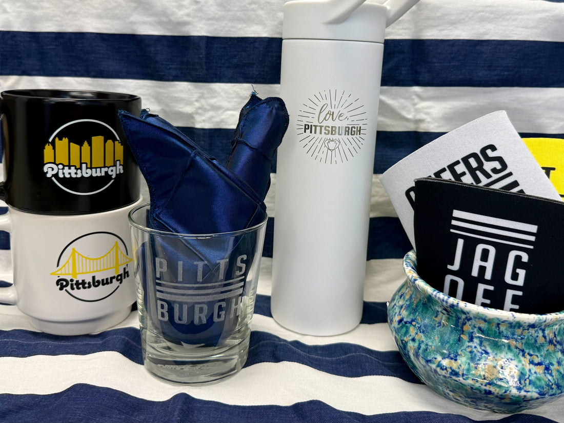 Cheers to long summer nights. Start your day with tea or coffee in one of our many mugs, like our popular stacking mug style. To take your drink on the go, our branded tumbler keeps your beverage cold for up to 24 hours or hot for up to 3 hours. For a happy hour under the stars, sip from our Rivers Stripe Rocks Glass. Keep all cans cold and cozy with a koozie. Cheers Yinz says it all.