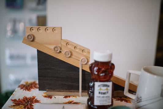 John and Millie create fun wooded toys with wheels, including trucks, trains, and our much loved incline toy.