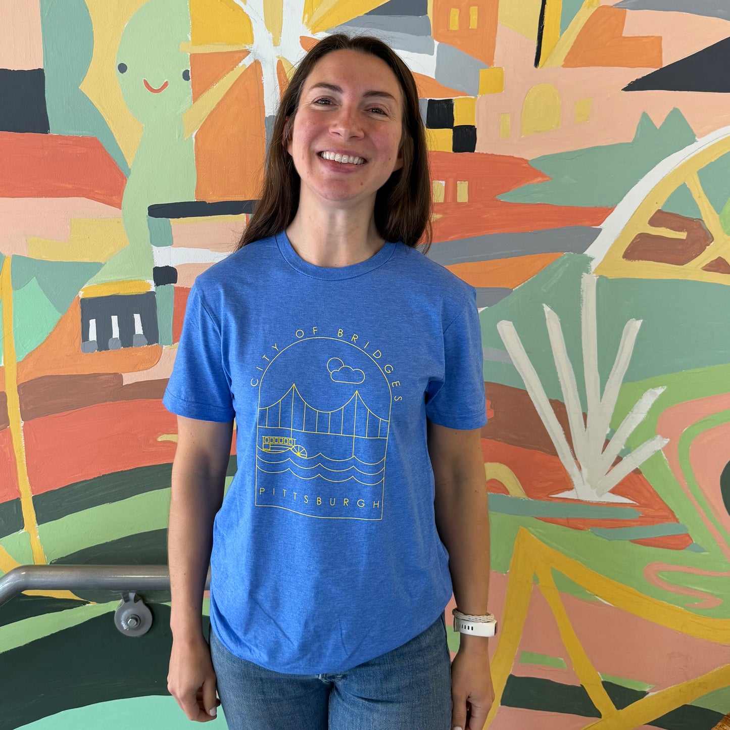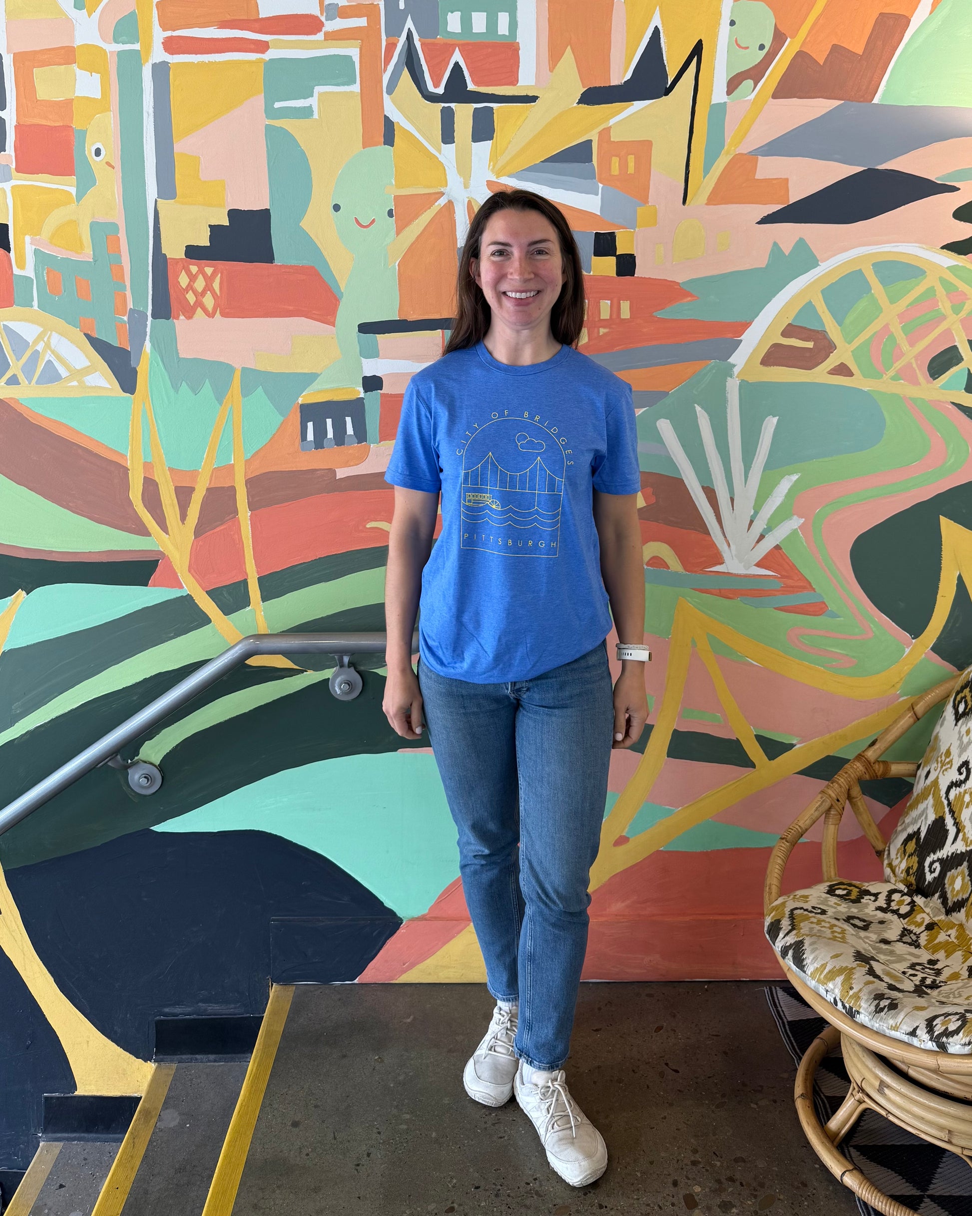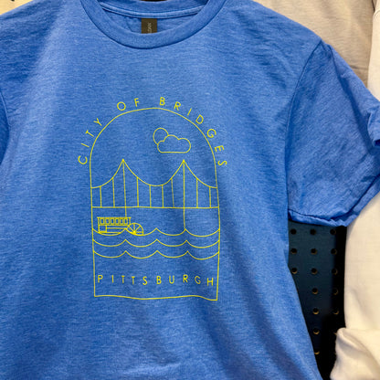 Our "City of Bridges" Tee in royal heather is a true celebration of the Steel City, featuring a vibrant yellow ink design of Pittsburgh's iconic bridges on the center chest. This eye-catching graphic is applied using a durable screen-printing technique. It's lightweight making it perfect for everyday wear.