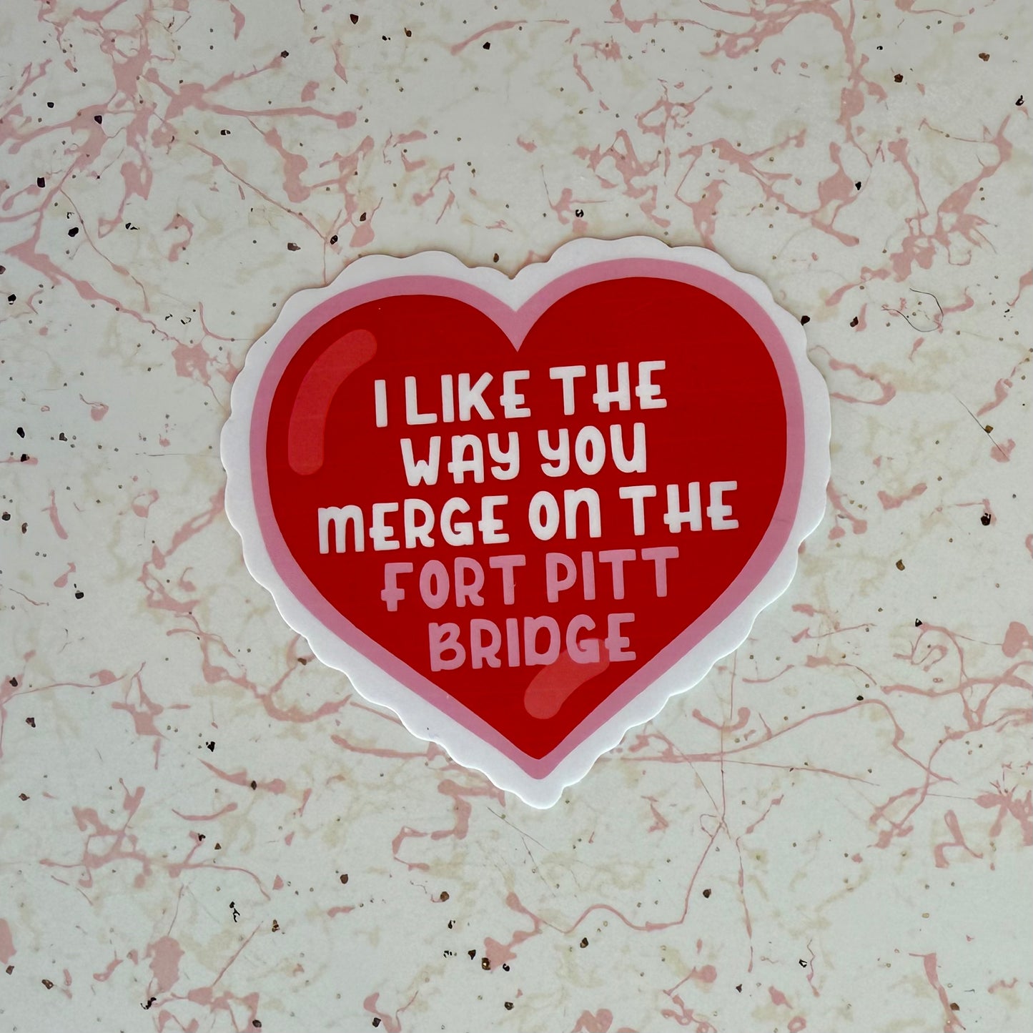 ‘I like the way you merge on the Fort Pitt Bridge’, vinyl sticker 3 in x 3 in, residue free, waterproof sticker