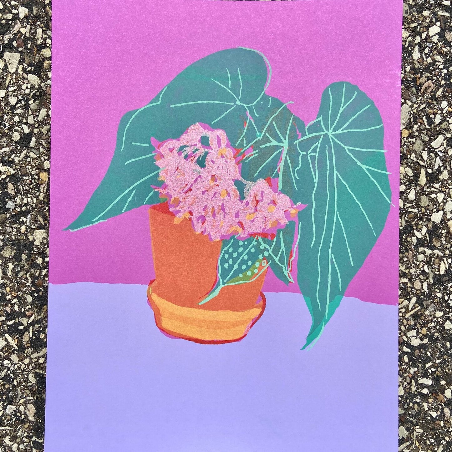 Vibrant six color screenprint of honeysuckle begonia blooms