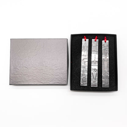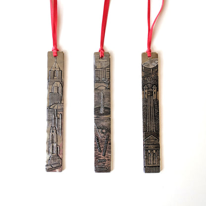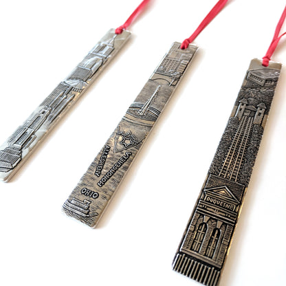 Beautiful set of three aluminum ornaments by Wendell August Forge. Featuring Pittsburgh scenes of the Point, Duquesne Incline, and landmark buildings.