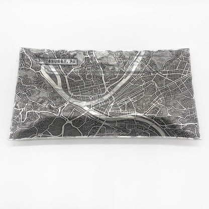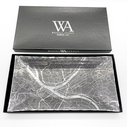 Celebrate where the Allegheny, Monongahela, and Ohio Rivers meet in with this handcrafted aluminum tray featuring a detailed map of the three rivers highlighting the Golden Triangle. Designed and made by Wendell August Forge, this tray is a functional piece of art and a tribute to the city’s heart.