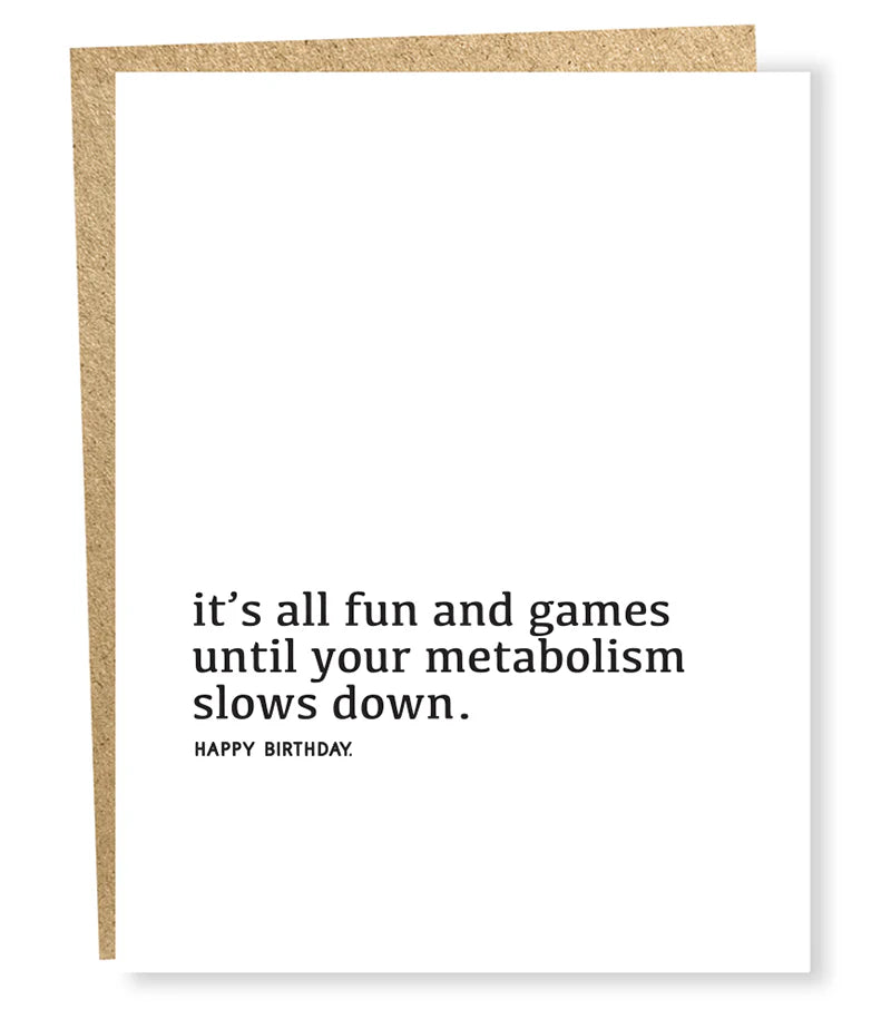 Gift a laugh with this birthday card stating, "It's all fun and games until your metabolism slows down. Happy Birthday."
