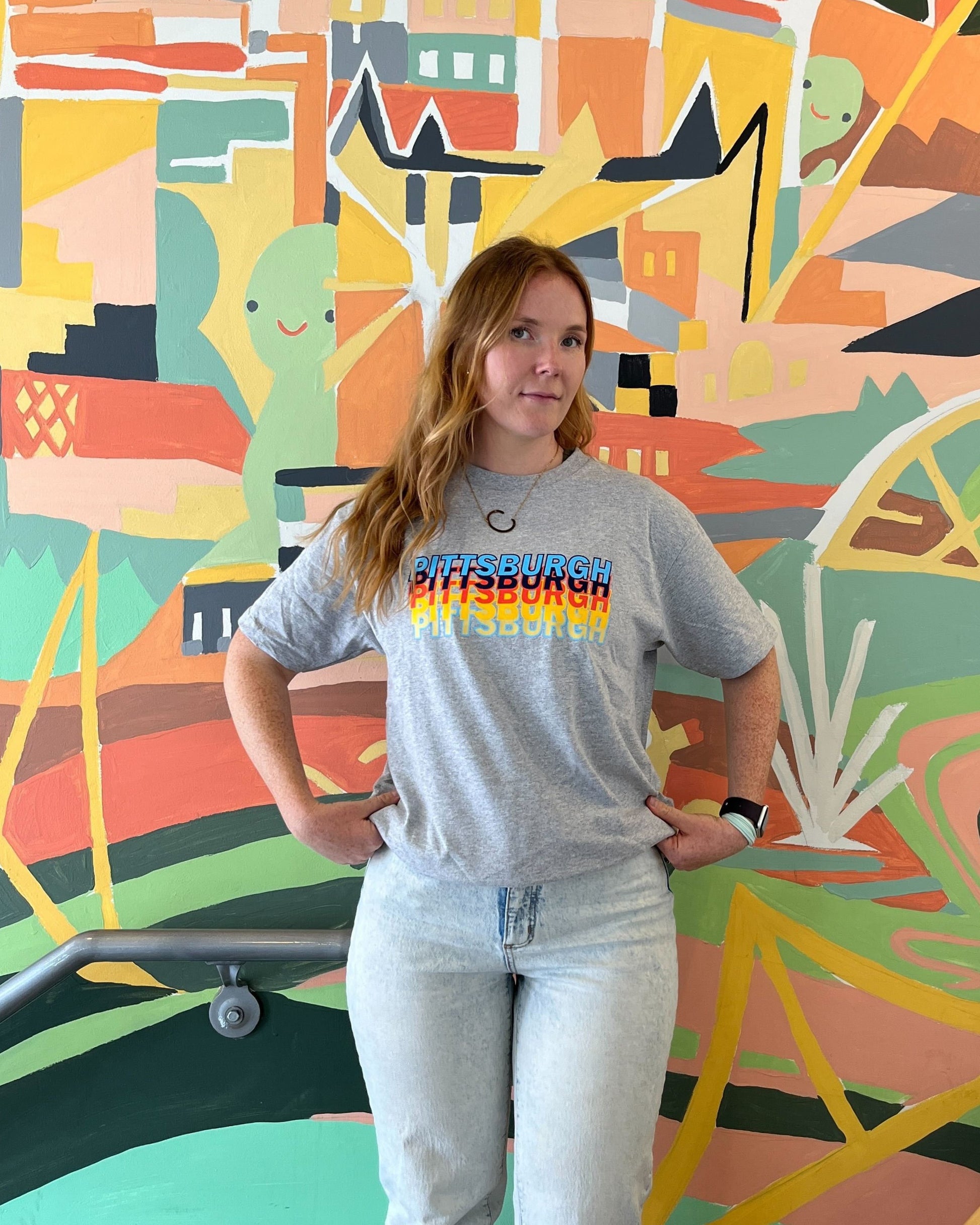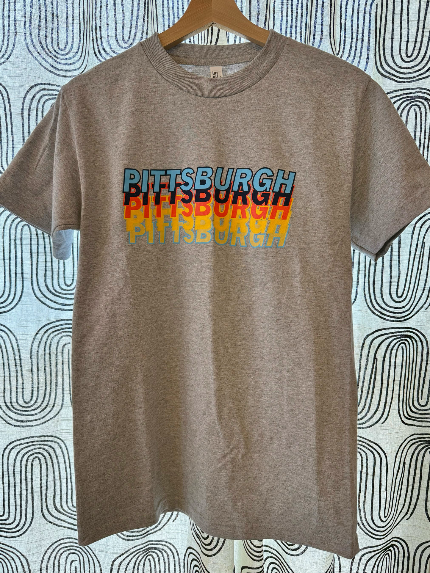 The Pittsburgh on Repeat Repeat Repeat Tee features a retro-style design with "PITTSBURGH" stacked in vibrant blues, yellows, and oranges. This colorful graphic pops on a soft heather grey shirt with a classic, vintage twist.