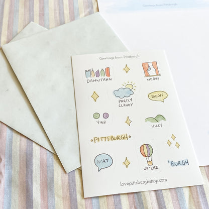 Set contains two different Pittsburgh design papers, two sheets of each design (4 pages total), a Pittsburgh Sticker Sheet, and 2 colored envelopes.