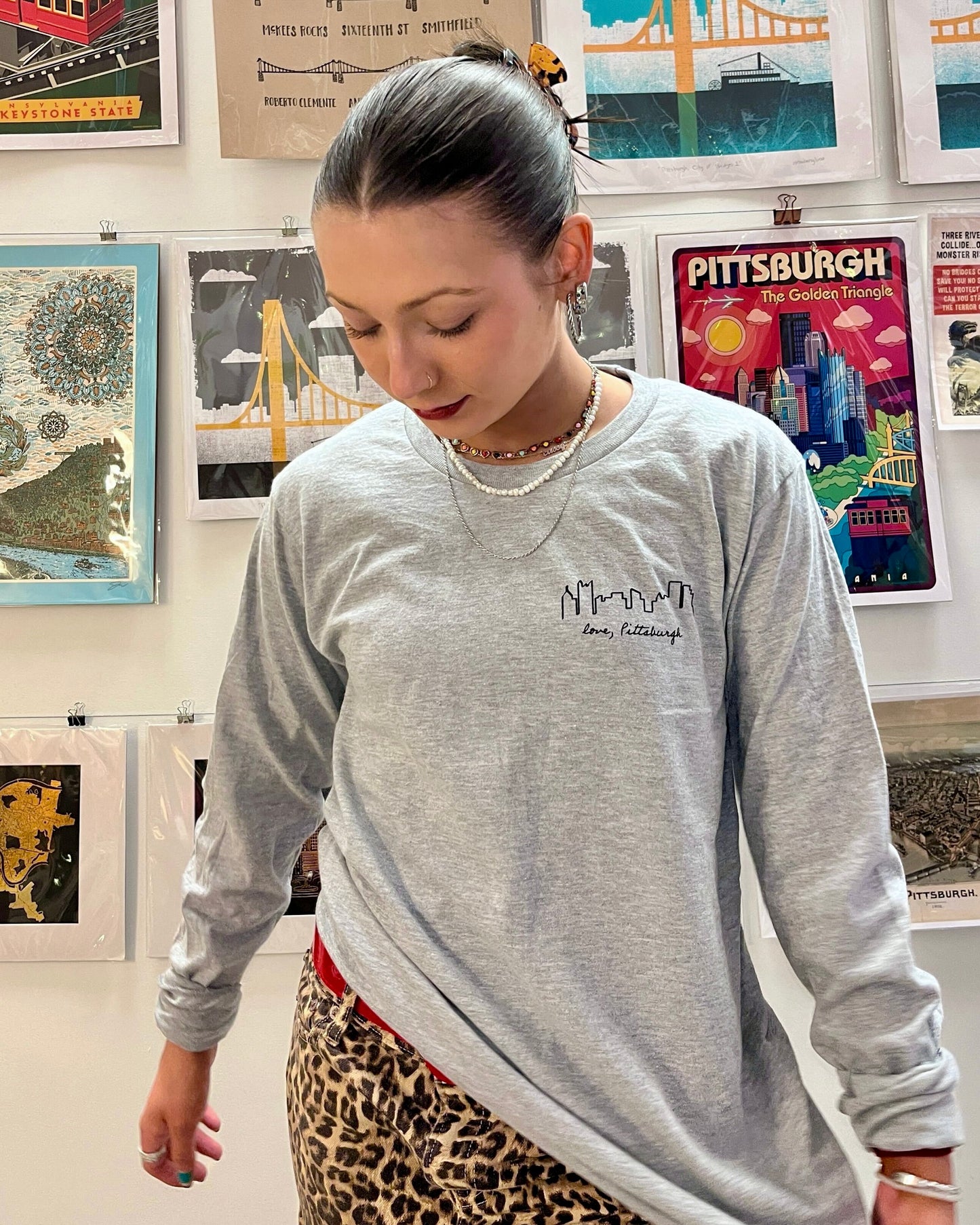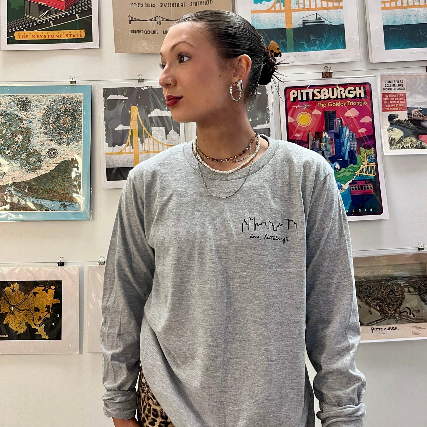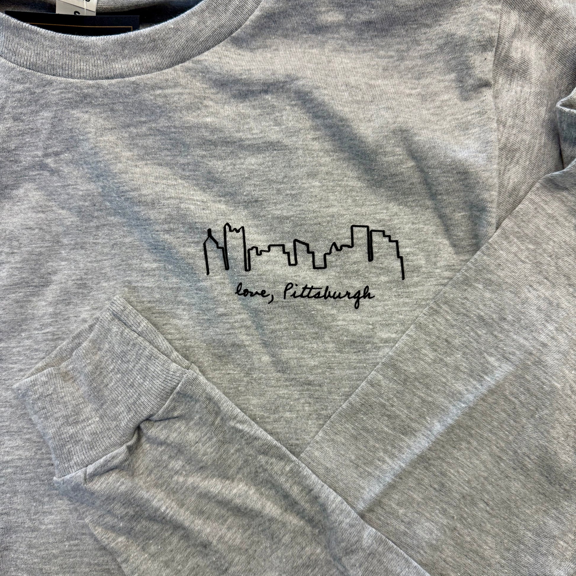 Get ready to conquer the city in style with our Skyline LS Tee in Heather Grey! This long-sleeved tee features a unique left chest print of the iconic Pittsburgh skyline with love, Pittsburgh written in cursive underneath in black ink. Made with a soft heather grey fabric, you'll be comfortable and cool as you take on the day. Don't blend in, stand out!