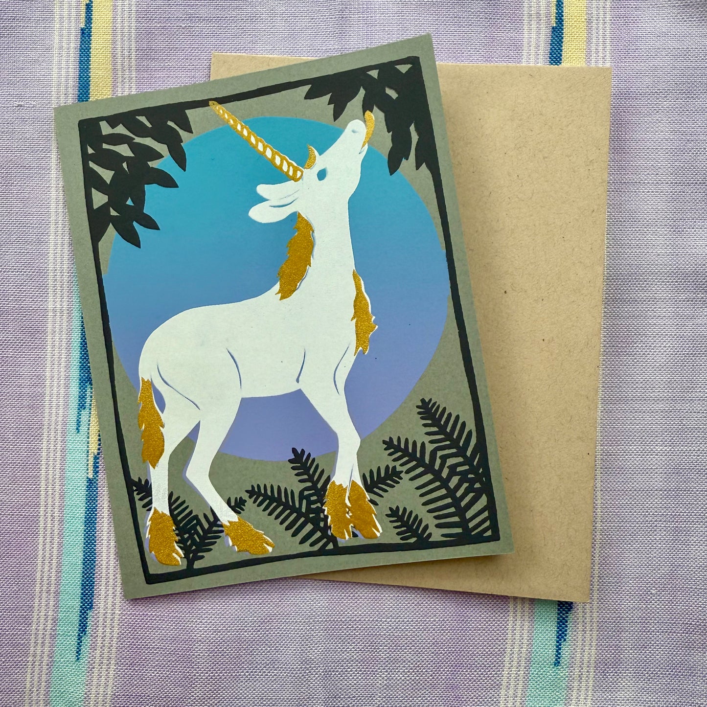 This unicorn greeting card is screen printed by hand from original paper cutting art. The four layer screen print includes a giant moon in the background with a blend from pale blue to lilac, foliage in dark grey, the unicorn in white, and accents in metallic gold.