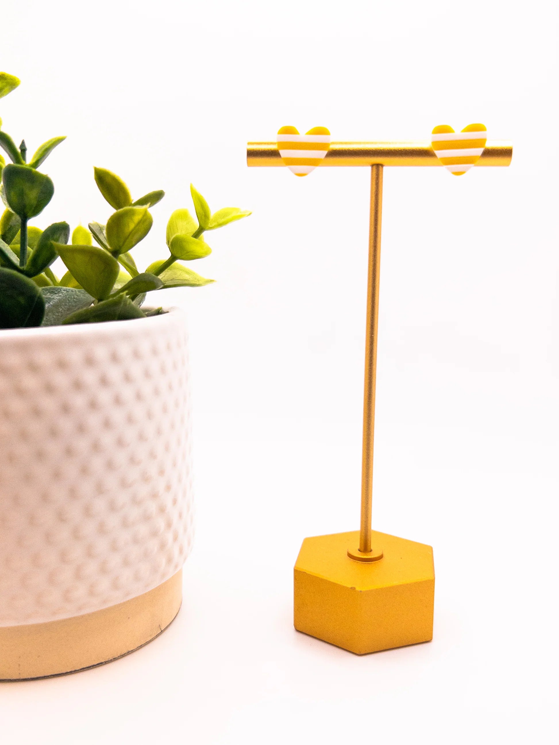 Add a playful pop to your day with these sunny heart-shaped studs. Featuring cheerful yellow and white stripes, these lightweight polymer clay earrings blend boldness with sweetness. Each pair is handcrafted, hypoallergenic, and ultra-comfy, made to bring a burst of joy to any outfit, from a casual tee to a flowing dress.